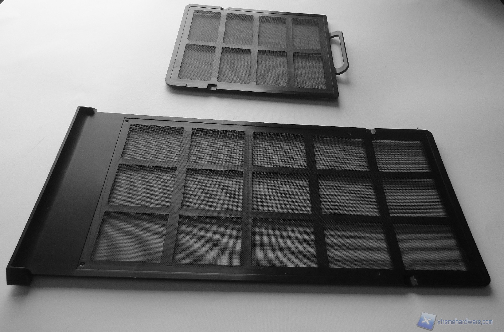 Il case poggia su 6 piedini di buone dimensioni (consentono di rialzare il case da terra di circa 3cm) e provvisti anche di gomma che ha sia una funzione anti-scivolo sia anti-vibrazione. Sul fondo del case notiamo diversi particolari. Partendo dalla parte frontale troviamo altre prese d’aria per la ventola frontale e notiamo come il fondo del telaio sia completamente formato da una griglia a nido d’ape, garantendo quindi un buon afflusso d’aria, mitigato dai due generosi filtri antipolvere facilmente removibili (quello posteriore è dotato di una piccola maniglia per facilitare l’operazione).