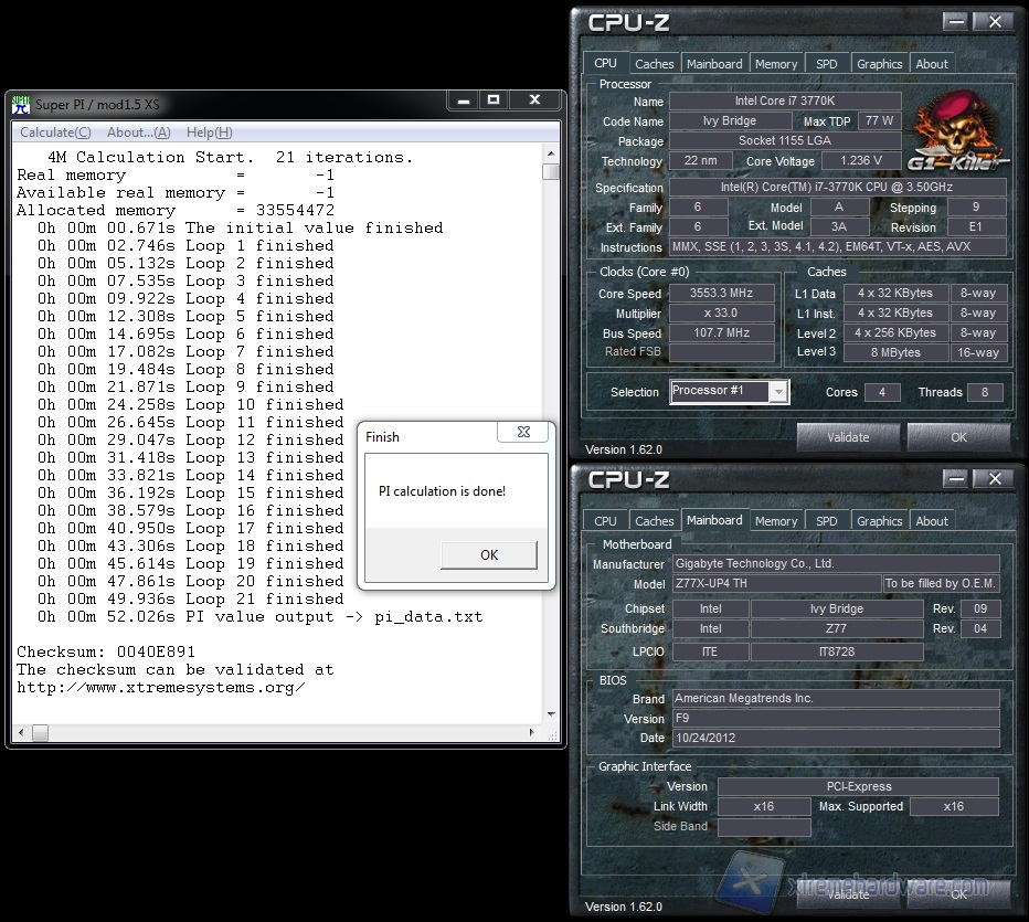 Siamo riusciti a concludere i 10 cicli di test alla frequenza di ben 4800 MHz, che considerando che stiamo parlando di una CPU di classe Ivy Bridge, è ottima. Soffermatevi sul valore computazionale di picco, ben 112,02 GFlops, il valore di tutto rispetto secondo solo alla MSI Z77 Mpower e conseguenza dell’ottimo lavoro svolto sia da Intel sul processore Ivy Bridge che ne ha potenziato l’ALU, sia dell’ottima sezione di alimentazione della Z77X-UP4 TH basata su tecnologia Ultra Durable 5 con Driver Mosfet  ecomponentistica selezionata . Sempre raffreddando il processore a liquido abbiamo effettuato i test di overclock per ricercare il massimo valore di Bclk.