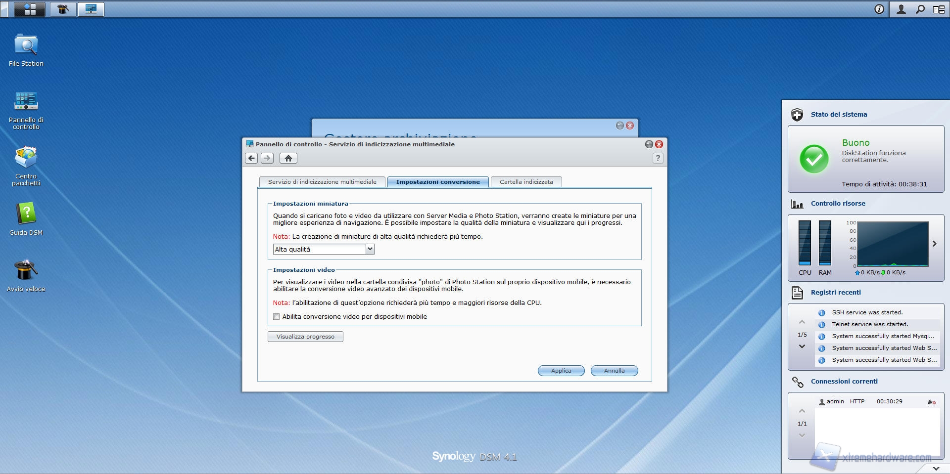 La prima schermata del “Servizio di indicizzazione multimediale” permette la scansione dell'intero sistema alla ricerca di file multimediali che verranno indicizzati e catalogati in maniera ordinata. La seconda tab, “impostazioni conversione”, permette all’utente di impostare la qualità delle miniature che si creano in Server Media e Photo Station nel momento in cui si caricano delle fotografie. La voce “impostazioni video” permette la conversione dei video necessaria per la visualizzazione tramite i dispositivi mobile. L’ultima finestra che incontriamo è “cartella indicizzata” che ci permette di creare una cartella, per l’appunto, dove verranno indicizzati tutti i file multimediali presenti all’interno del sistema.